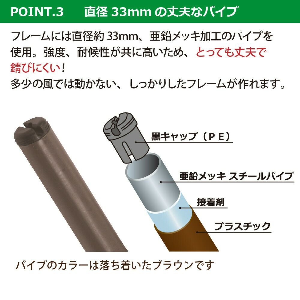 骨組みのパイプは亜鉛メッキパイプ(樹脂コーティング)を使用しており、丈夫で長持ちします。