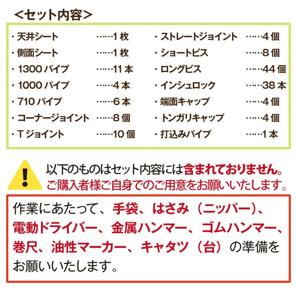 パイプの骨組みを組み立てて、パッカーでビニールを留めていくだけのシンプルな作りで組み立ても カンタンです。必要な部材は全てセットになっているので、組み立てのイメージがしやすく、自分で部材を考えて購入する手間も省けます。