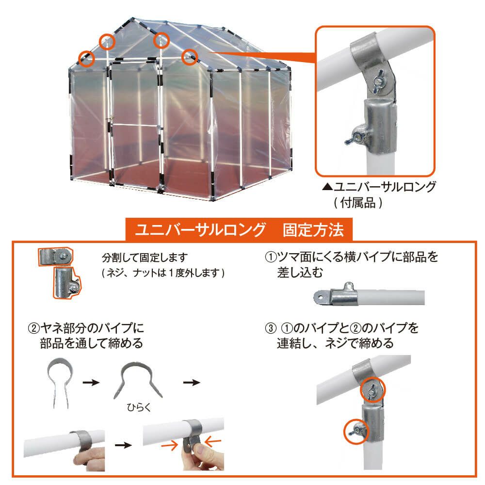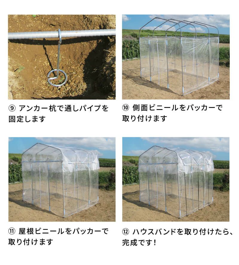 パイプの骨組みを組み立てて、パッカーでビニールを留めていくだけのシンプルな作りで組み立ても カンタンです。必要な部材は全てセットになっているので、組み立てのイメージがしやすく、自分で部材を考えて購入する手間も省けます。