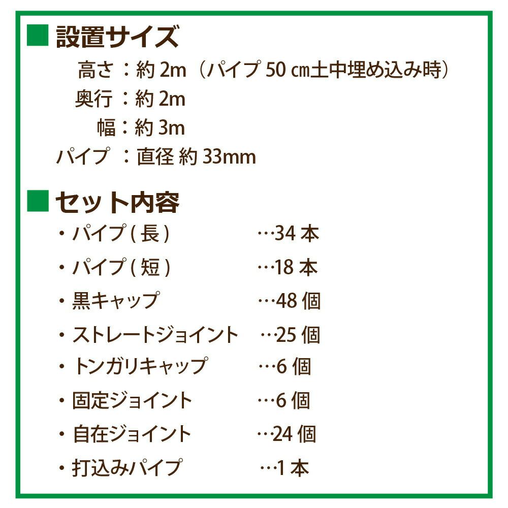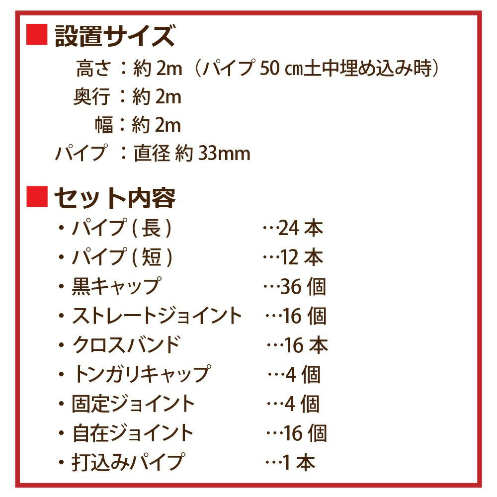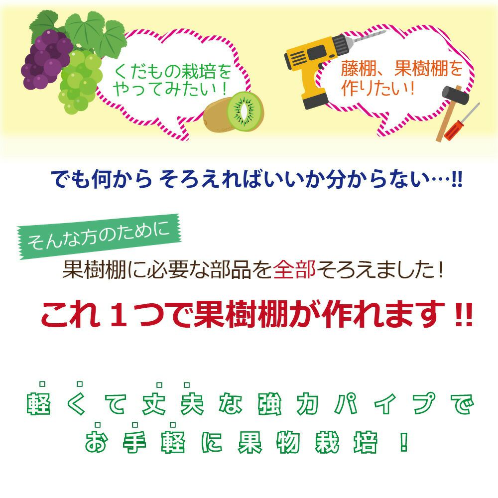 パイプの骨組みを組み立てて、パッカーでビニールを留めていくだけのシンプルな作りで組み立ても カンタンです。必要な部材は全てセットになっているので、組み立てのイメージがしやすく、自分で部材を考えて購入する手間も省けます。