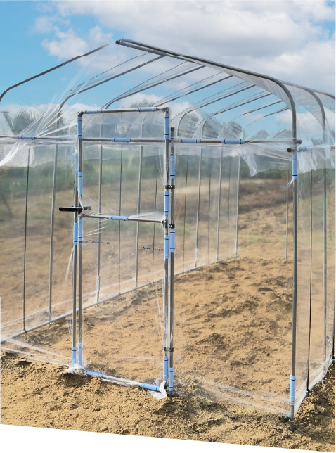 ダイムハウスの部材は農業用としても使用されています。ビニールは農業用ビニールで透明性が高く、 日中は日光を多く取り入れることができ、保温性が高く、取り入れた熱を逃がしません。 骨組みのパイプは亜鉛メッキパイプ(樹脂コーティング)を使用しており、丈夫で長持ちします。