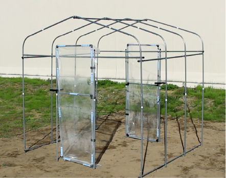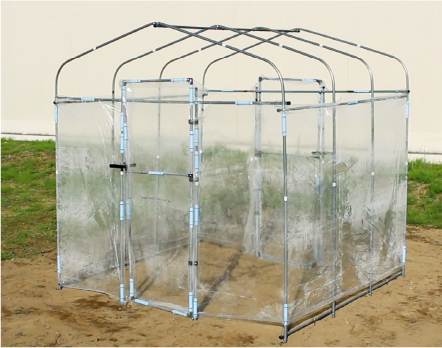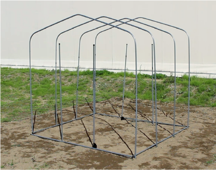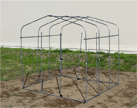 ダイムハウスの部材は農業用としても使用されています。ビニールは農業用ビニールで透明性が高く、 日中は日光を多く取り入れることができ、保温性が高く、取り入れた熱を逃がしません。 骨組みのパイプは亜鉛メッキパイプ(樹脂コーティング)を使用しており、丈夫で長持ちします。