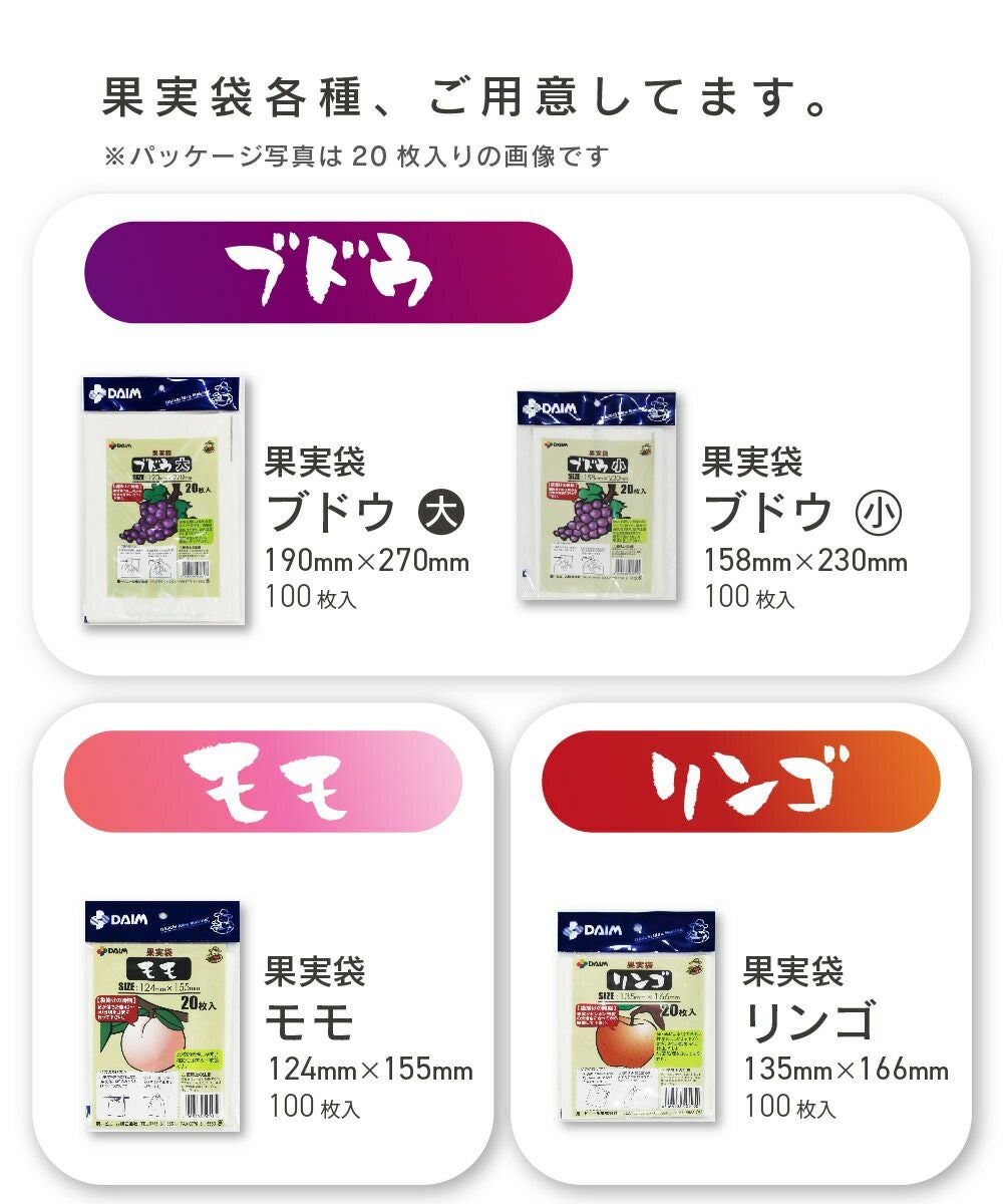 他の画像を見る 雨や風による果実の肌荒れやキズを防ぐ daim 果実袋 100枚入り ブドウ 大 190mm×270mm 当店特別価格 ¥ 1,540 税込 会員特別価格 ¥ 1,470 税込 カートに入れる お気に入りに登録する